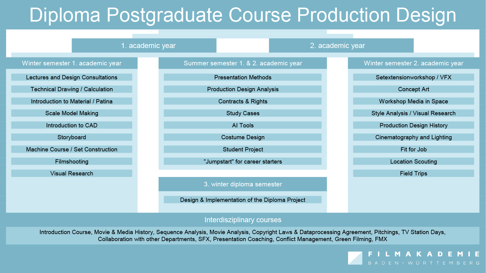 Within the two-and-a-half-year postgraduate diploma course in Production Design, students are taught both creative-artistic and organisational-technical content that prepares them for real production conditions, from research, initial design sketches, concrete production design concepts and their direct structural implementation during exercises/workshops through to theoretical class content such as image analysis, film and television history, costume design and costing.